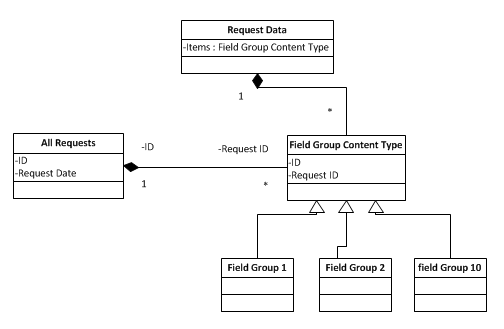 So I do have such a constructor but my problem is how better organize my datat storage. So far I have two variants and i’d like yo discuss shich one would better suit my needs. But before I’d like to describe the structure of a request. We have 30 types of requests. Each request type consists of several group of fields (in order to group fields in the web form, but not only). Let’s suppose we have 3 block of fields — A, B, and C. Then requests could look like this: