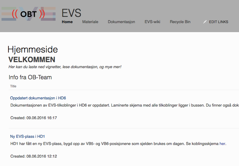 The front page is your standard wiki page, residing within the “site pages” folder. The page itself shows the title of the page, literally called “home page” in norwegian (Hjemmeside). It kind of messes up the design.