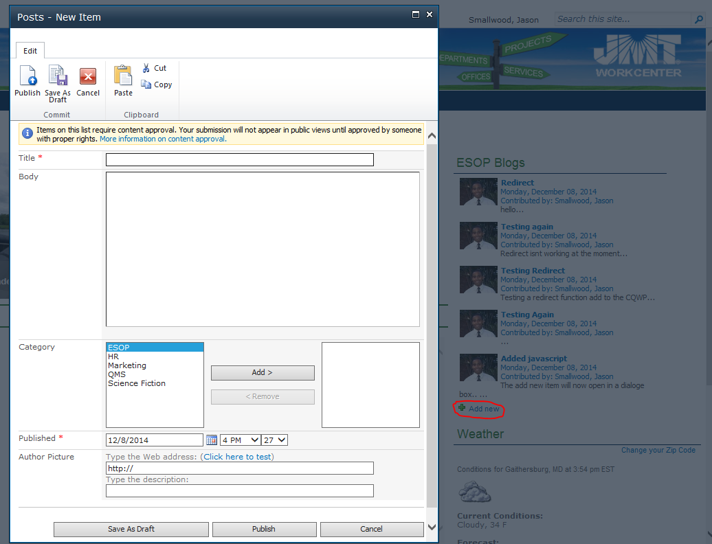 I have a CQWB on my intranet home page which displays Blog Post entries. This CQWP has a ‘Add new Item’ link which when clicked, opens the NewPost.aspx form in a dialogue box. I achieved this by adding the following to my .xsl file associated with the CQWP: