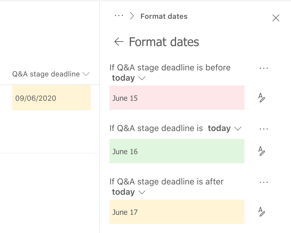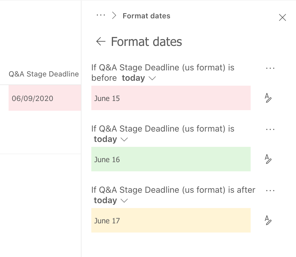 You will see on the screenshot below are two columns. Q&A Start Date which is a date and time field and Q&A Stage Deadline which is a calculated date field. The Start Date is displaying the correct colour but the Stage Deadline field isn’t.
