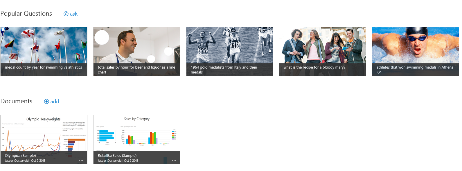 The main menu shows an overview of 5 popular questions based at the two Excel sheets you see under Documents. Let’s start and ask a question, I click on Ask: