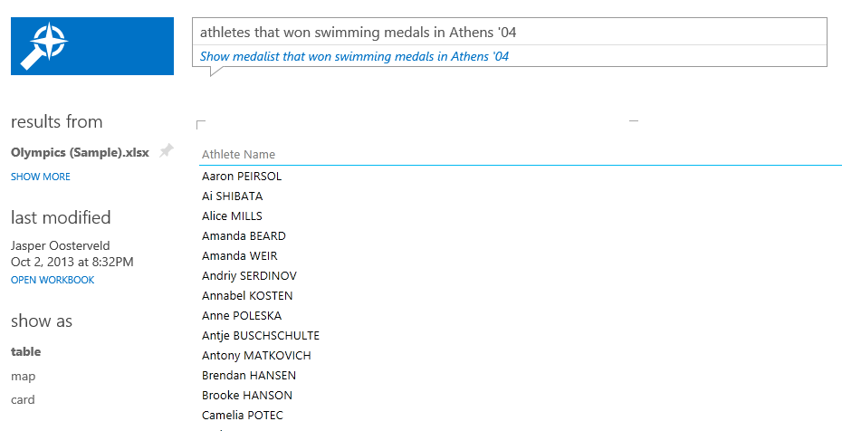The demo contains two Excel sheets: Olympics and Retail. A selection of questions is already present and ready to be selected. Let’s click on athletes that won swimming medals in Athens ’04: