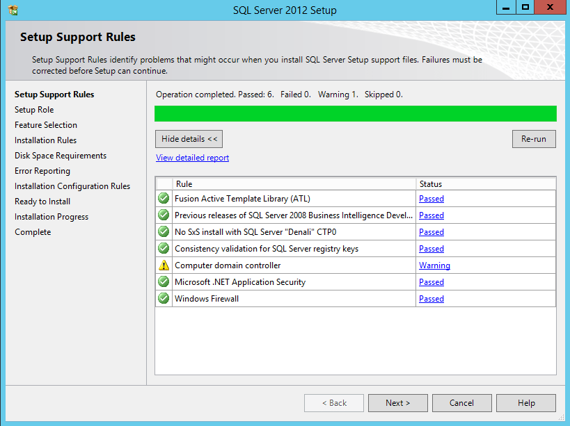 6. On the Setup Support Rules screen, the Installer checks for any potential issues that have occurred during the installation.