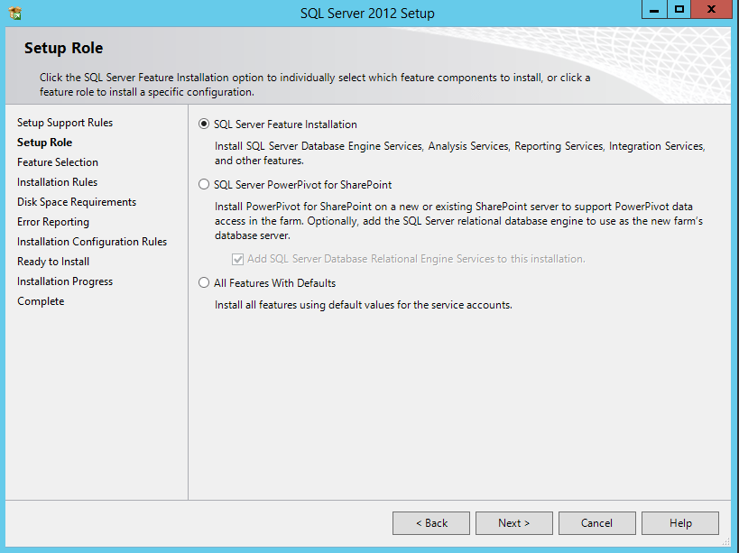 12. On Setup Role screen, select the SQL Server Feature Installation radio button and click the Next Button to continue
