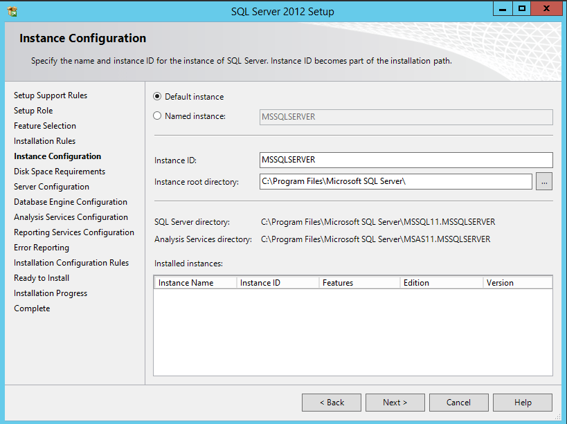 15. On the Instance Configuration screen, you can choose the default SQL Server Instance or create a new Named Instance. Also, you should be able to change the Instance directory on Windows Server 2012 R2. Click on Next button to continue