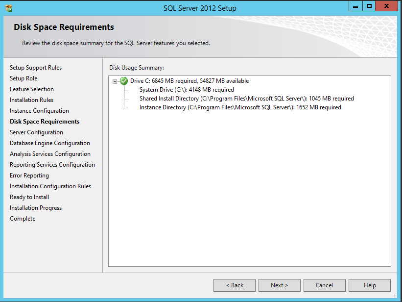 16. On the Disk Space Requirements screen, you will be able to see the details about the required disk space for installation. If your Windows Server 2012 R2 has enough space to install then you can click on Next button to continue
