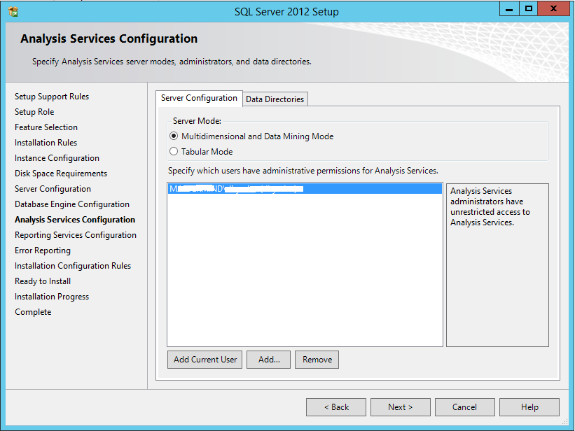 19. On the Analysis Services Configuration screen, select the current logged in user as a System Administrator for Analysis Services. Click on Next button to continue