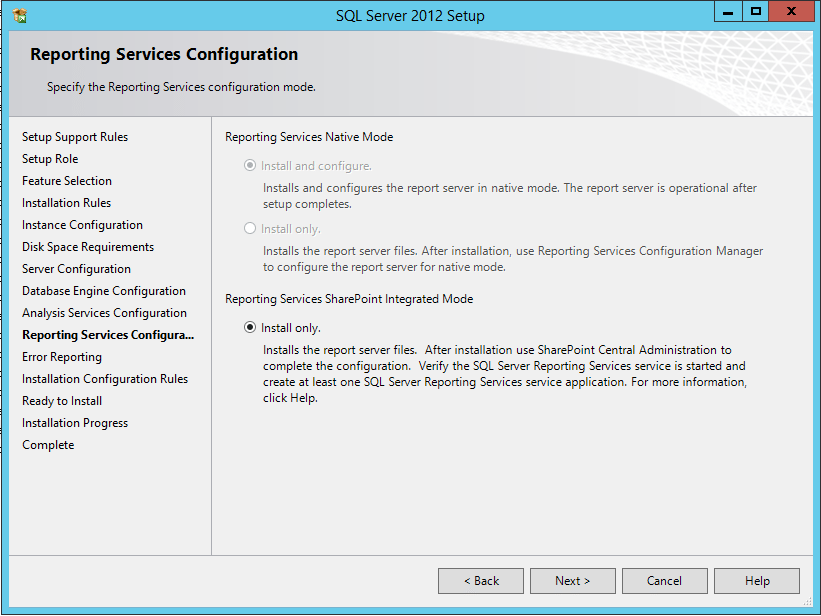 20. On the Reporting Services Configuration screen, select the Install Only radio button and click on Next Button to continue