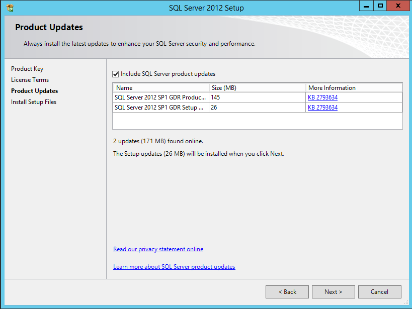 9. On the Product Updates screen you will be notified of any hot fixes or updates for SQL Server 2012 that are relevant to this installation. Click on Next button to continue
