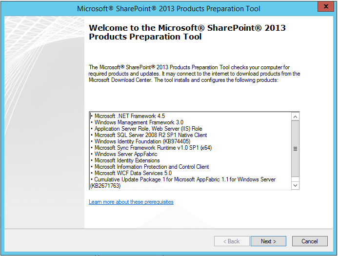 3. In the following Microsoft SharePoint 2013 Products Preparation Tool screen, you will be able to see the complete list of the prerequisite products for installation. Click on Next button to continue