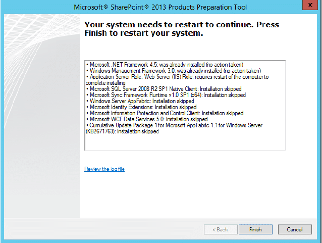 8. In the following screen, you will be asked to restart the Server once all the components that are mentioned in step 6 are configured and installed. Click on Finish button to close the screen