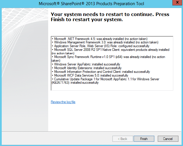 5. In the following screen, the Prerequisite Installer will enable the Application Server Role on your server. Then you will be asked to restart the Server. Click on Finish button to continue