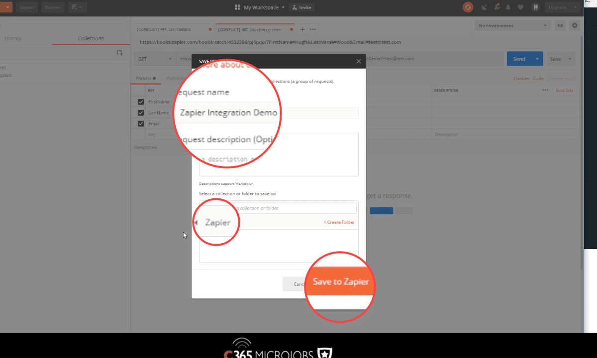 On the ‘Save Request’ Screen enter a ‘Request name’ and add a new collection called ‘Zapier’.